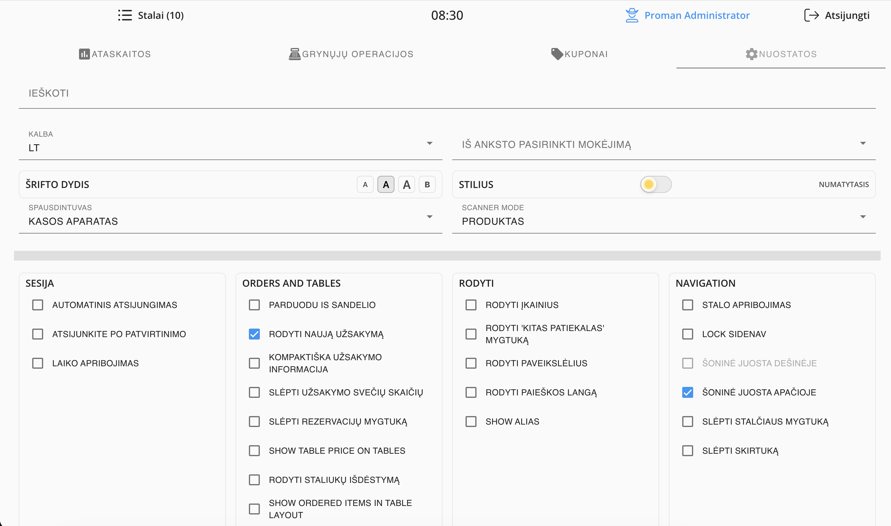 Įjunkite tik tai, ko reikia. Slėpkite mygtukus, kurių nenaudojate. Pridėkite paieškos lauką, kitą patiekalo mygtuką — kad virtuvė žinotų, ką ruošti toliau — ar keiskite ekrano išdėstymą.