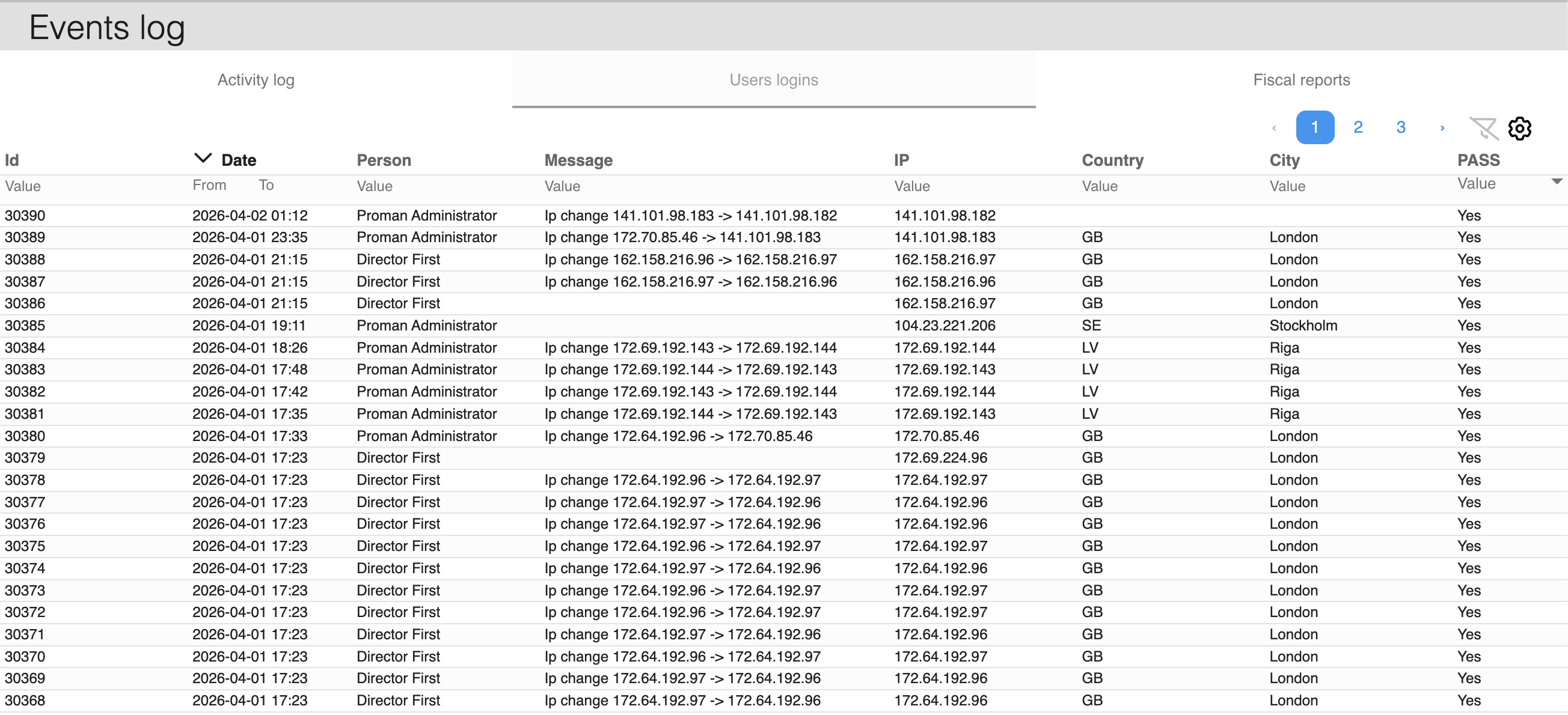 All system actions — IP addresses, countries, cities, and exact timestamps.