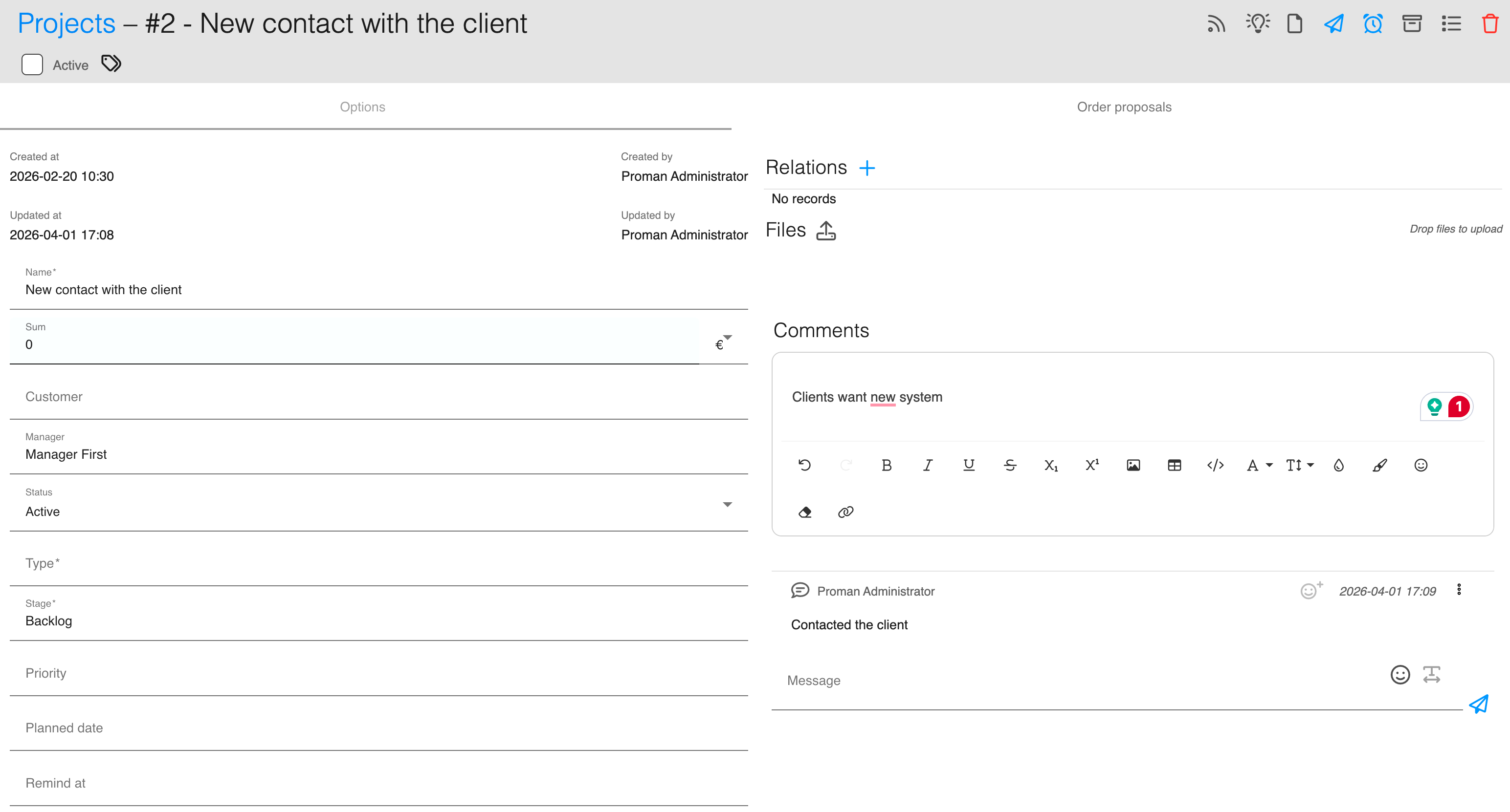 For every project you see the full proposal history, latest actions, and related documents. Create proposals from a custom template and send them to the client directly from the system.