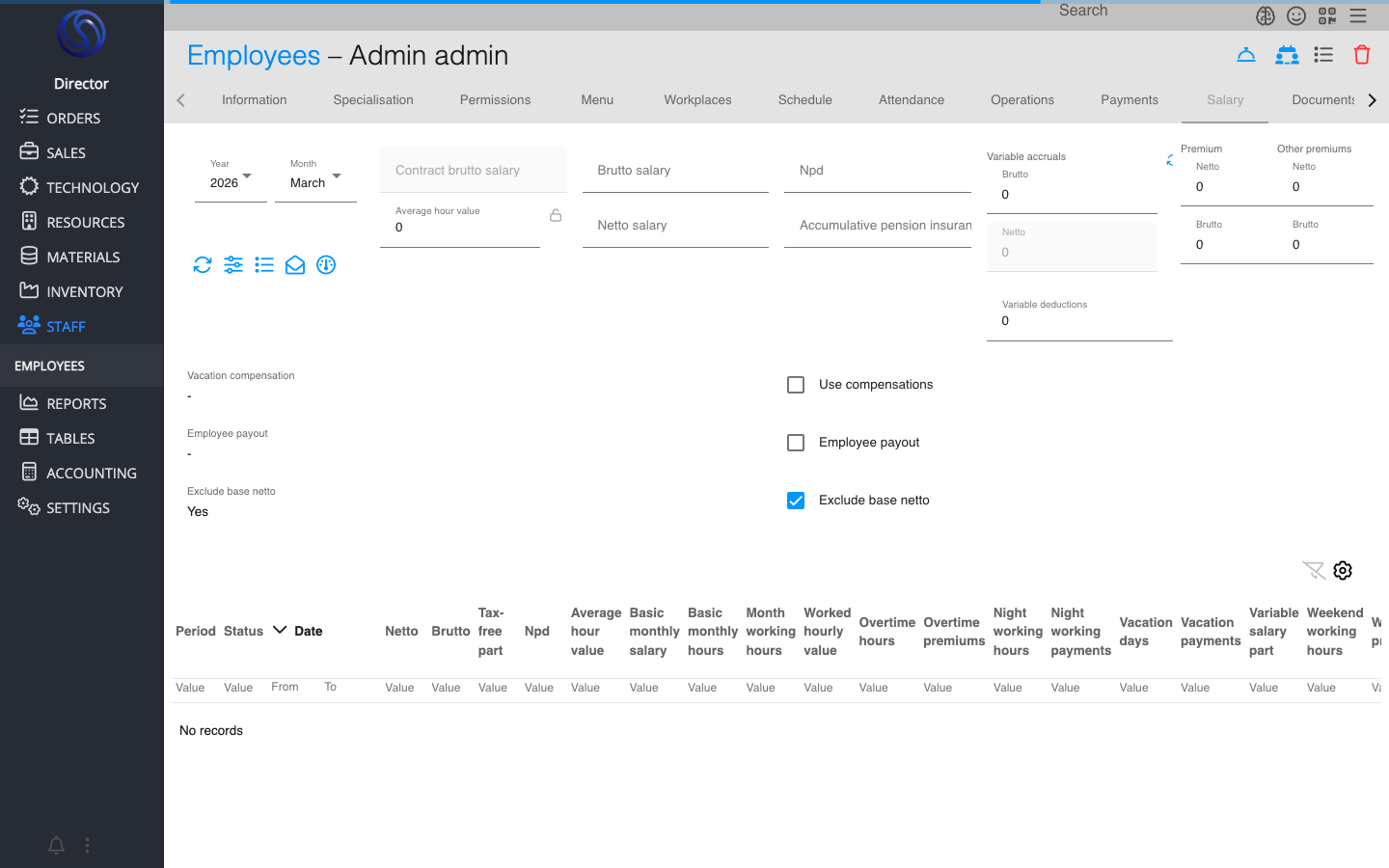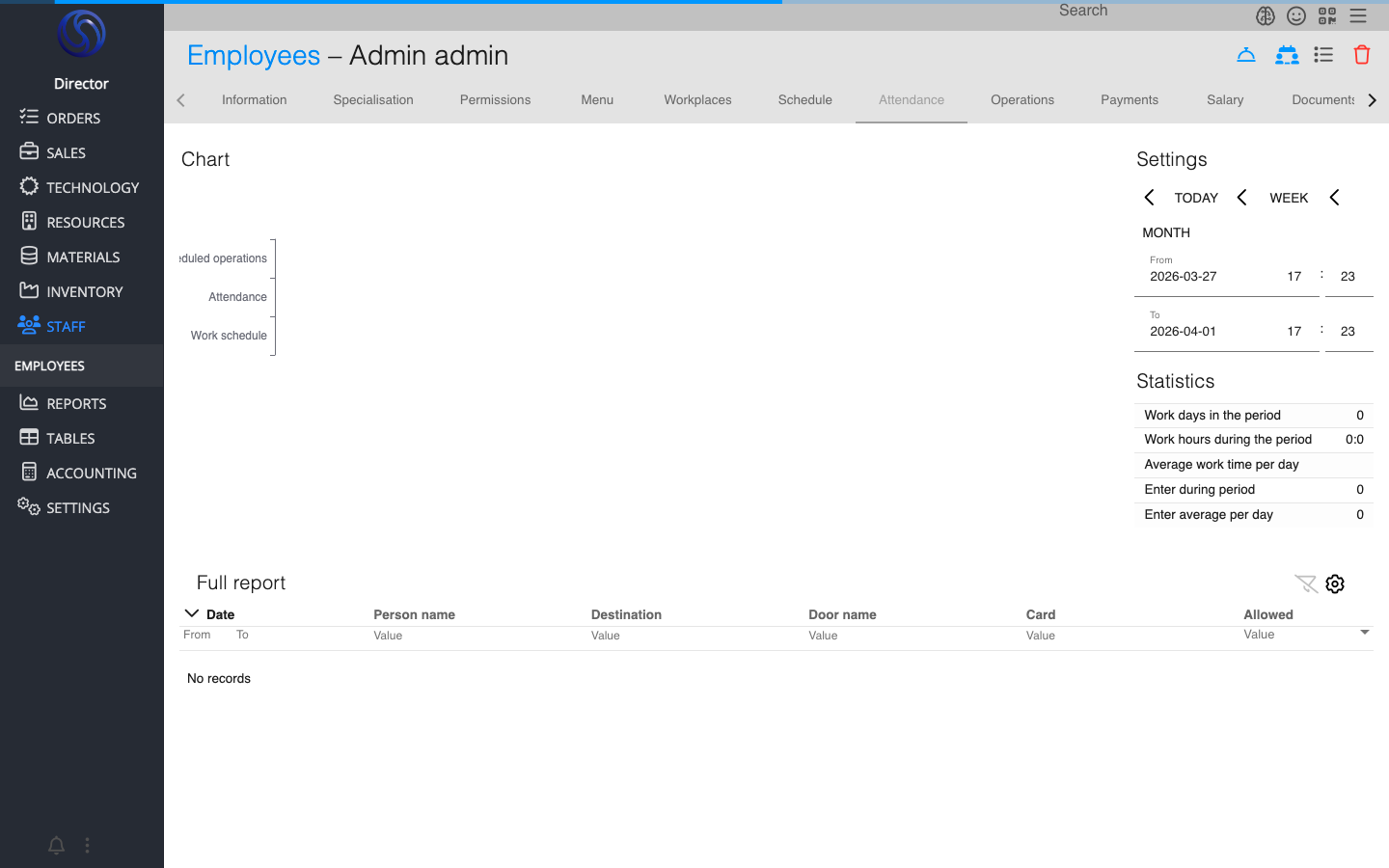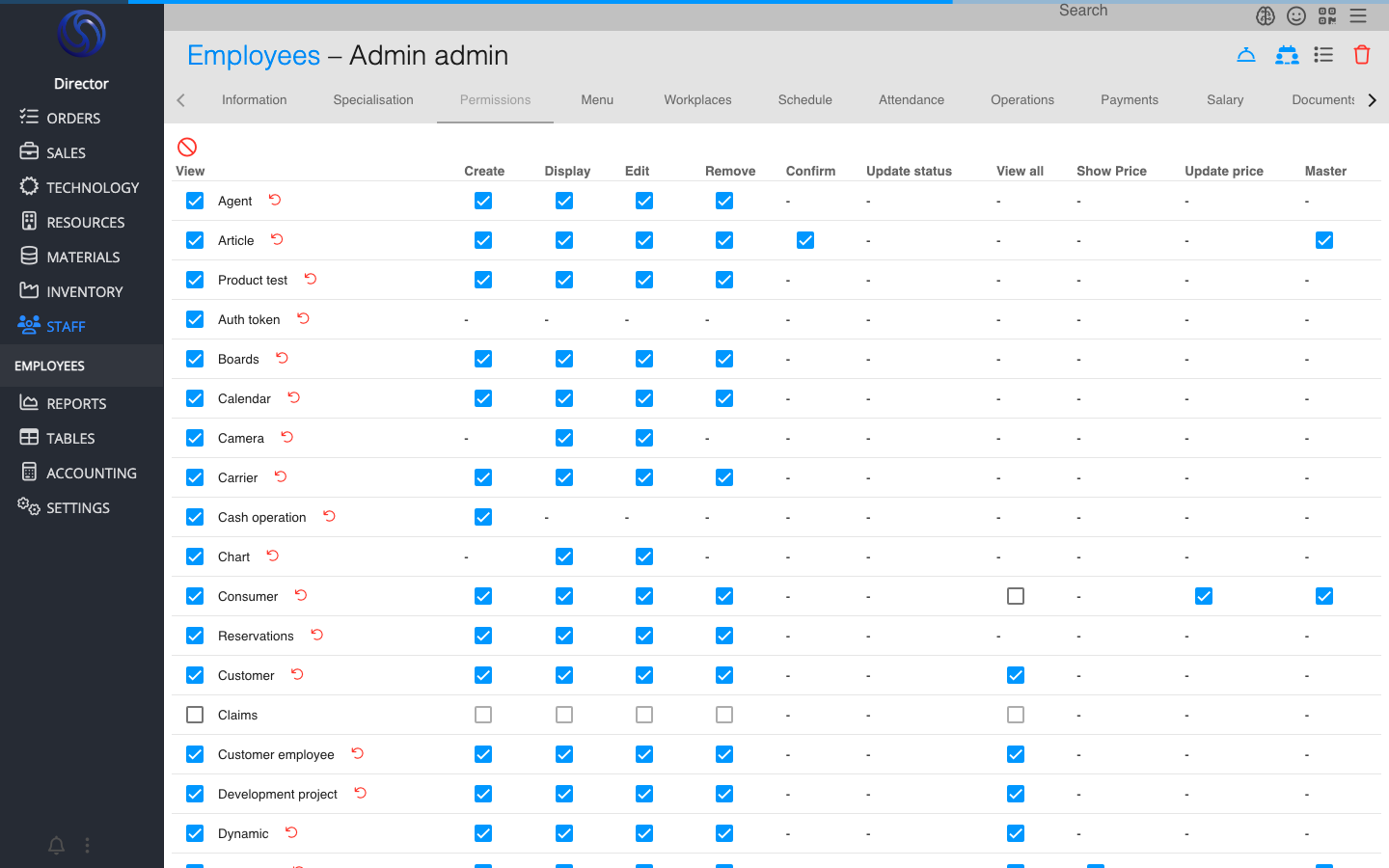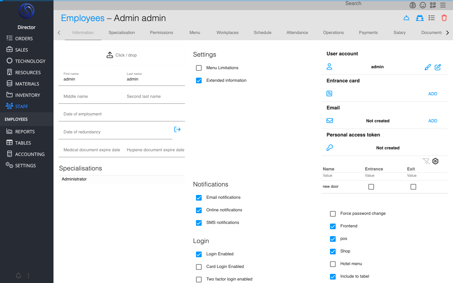 InformationSpecialisationPermissionsMenuWorkplacesScheduleAttendanceOperationsPaymentsSalaryDocumentsVacations