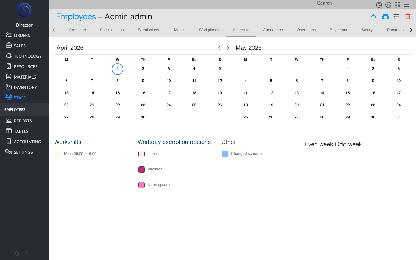 A visual calendar view with shifts and working time exceptions. Supports even/odd week cycles, holidays, and exception reasons.