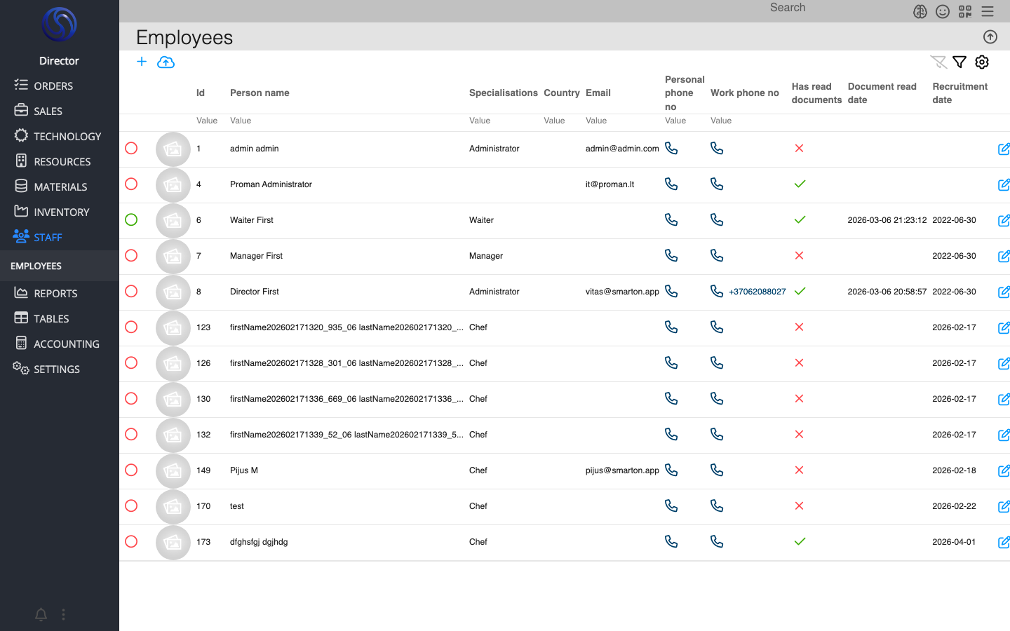 Employee list with specialisations, email, phone, workplace, and document status. Find the right person quickly and open their profile.